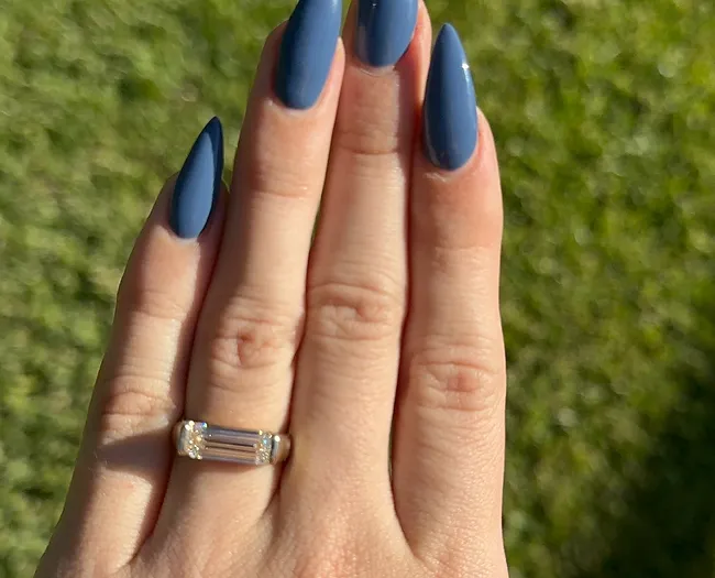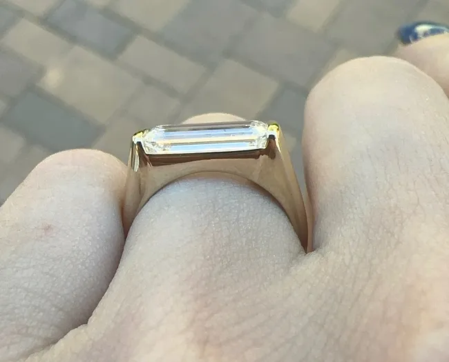 The captivating 2.01 carat lab-grown diamond takes center stage, and its elongated emerald cut offers a remarkable play of light. The H color and VS1 clarity make it a diamond of exceptional quality, ensuring brilliance that leaves a lasting impression. The east-west setting not only adds a unique twist to the design but also provides a low-profile and smooth fit that's perfect for active moms and anyone seeking a comfortable yet elegant piece.